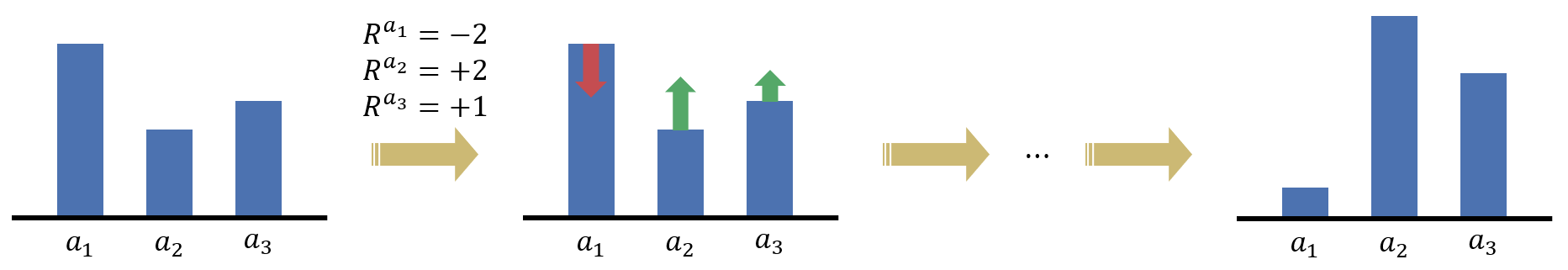 通过与环境的交互,或者说数据采样,我们知道在状态时采取不同的动作会有不同的“奖励” (注意这里所说的“奖励”不等同于上文中的reward或者value,而是一种抽象的衡量动作好坏的标准,在具体的算法里有不同的形式),正向“奖励”表示动作在当前状态下有“有益”的,需要逐步提高其执行概率,“奖励”越高,提高越多;而负向“奖励”表示动作在当前状态下有“有害”的,需要逐步降低其执行概率,“奖励”越低,降低越多。这样经过多次迭代后,就会形成新的策略函数,,且。此时状态下新的预期“奖励”表示为,